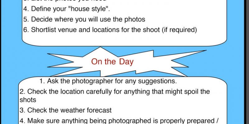 6.  Agree a deadline for receiving the finished photos.  Set a realistic timescale for getting the photos back and agree how they should be delivered.  Do you want them sent electronically or put on to a CD/DVD?  Agree what resolution you need for each media type and make sure you understand the copyright terms and their implications.